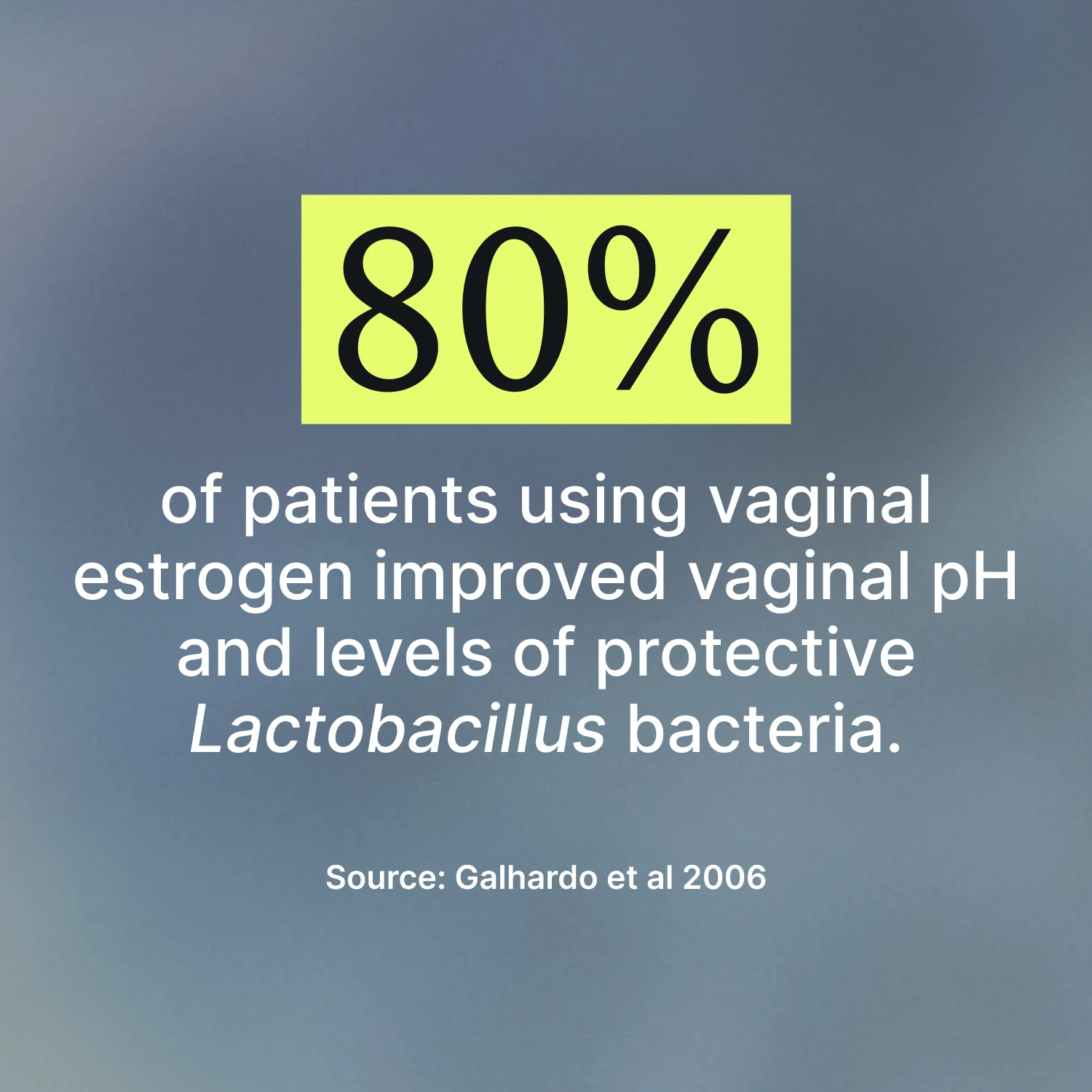 of patients using vaginal estrogen improved vaginal pH and levels of protective Lactobacillus bacteria. (Galhardo et al 2006)