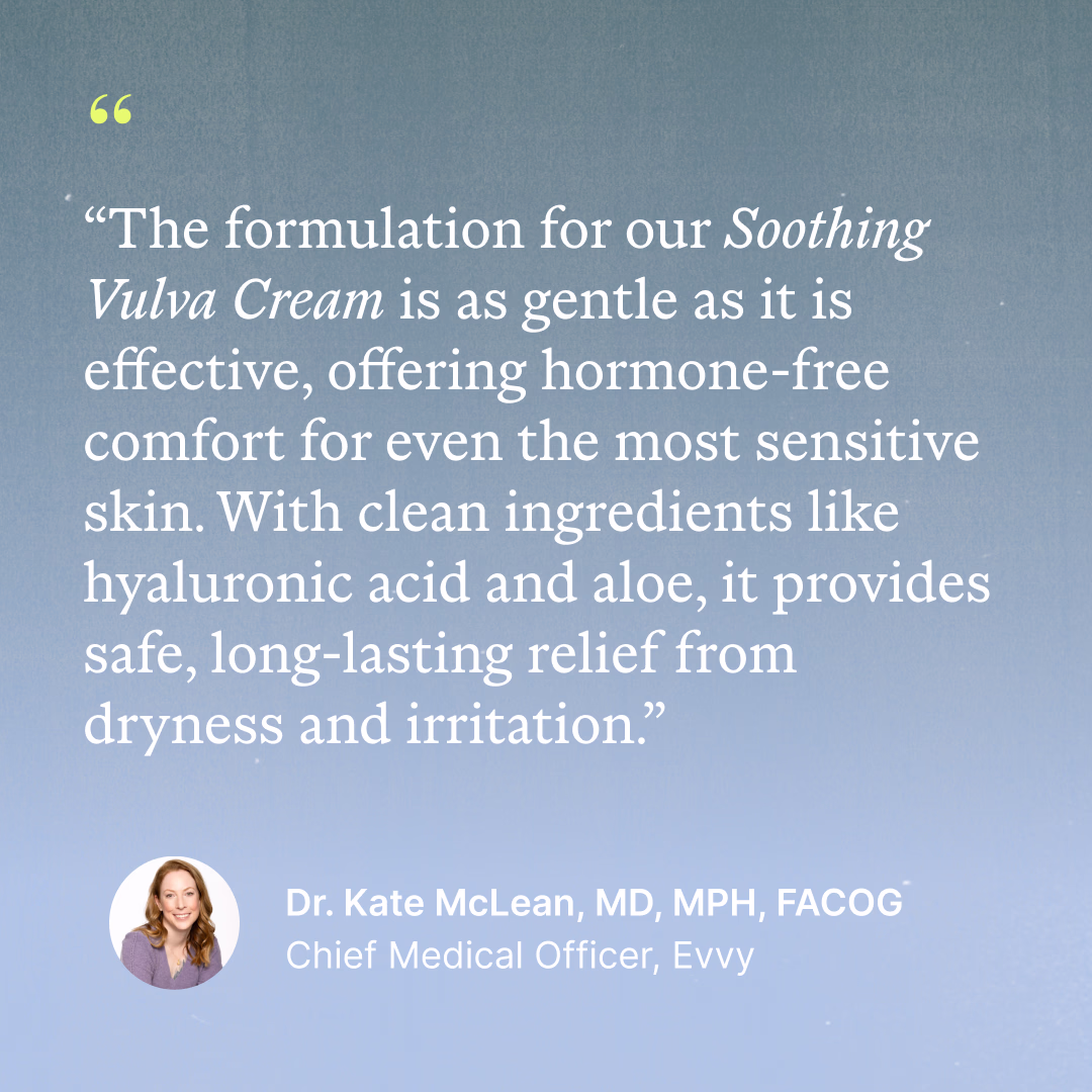 Formulated with prescription-grade hyaluronic acid, aloe, and vitamin E, our Soothing Vulva Cream is packed with ingredients shown in clinical studies to soothe and moisturize — in some cases just as well as estrogen — but without the hormones.