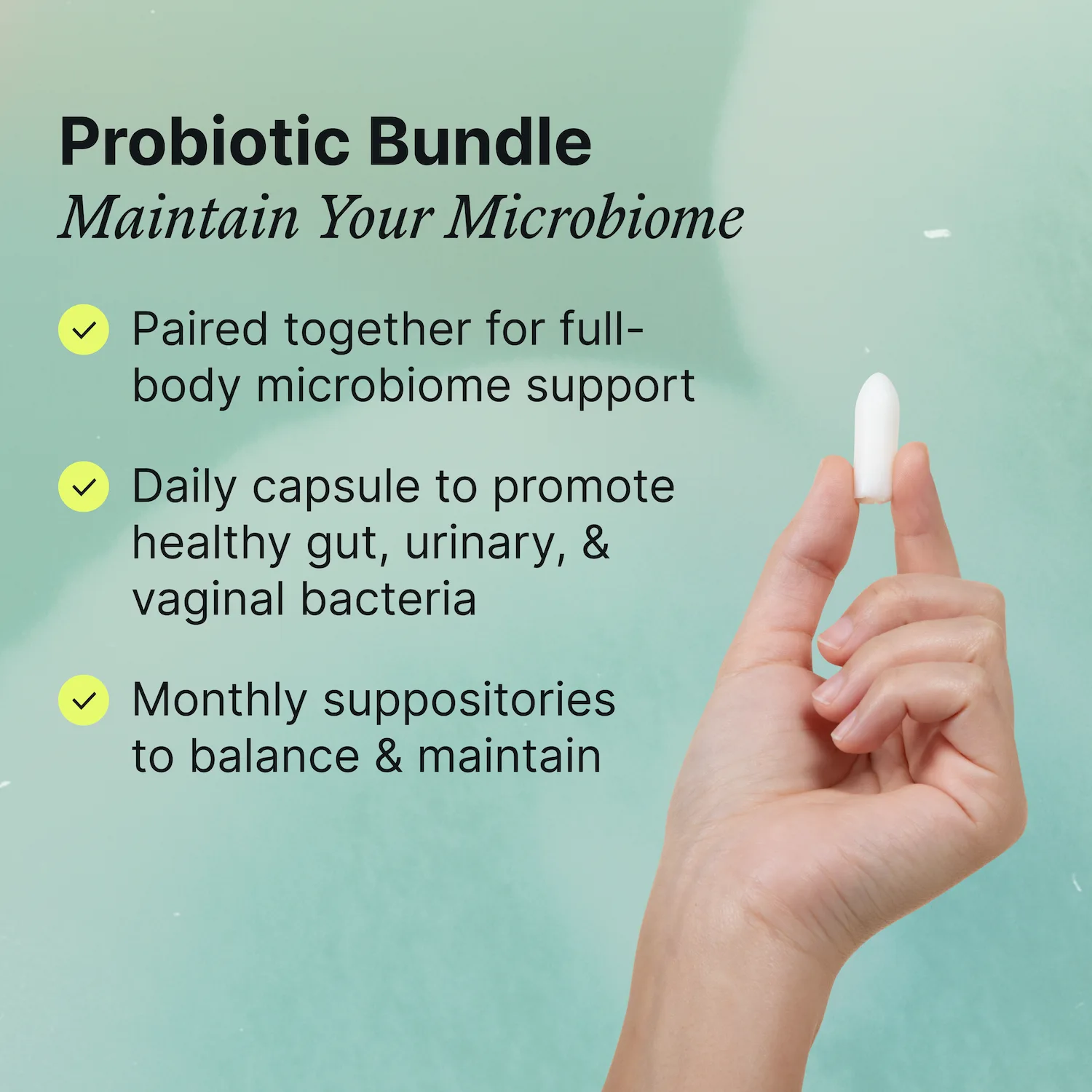 Our holistic probiotic duo combines daily oral capsules with targeted, as-needed vaginal suppositories.