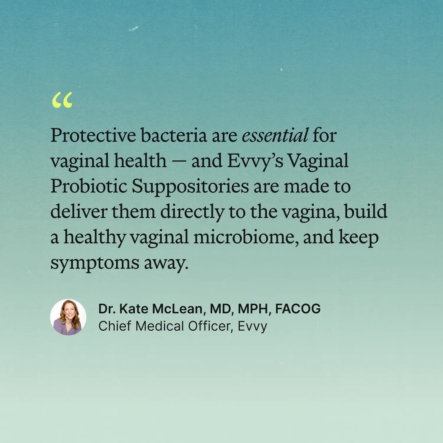 Our suppositories are a prescription product; a licensed, Evvy-affiliated provider will determine your prescription at their sole discretion. Statements about the Women’s Complete Probiotic have not been evaluated by the FDA. This product is not intended to diagnose, treat, cure, or prevent any disease.